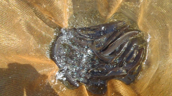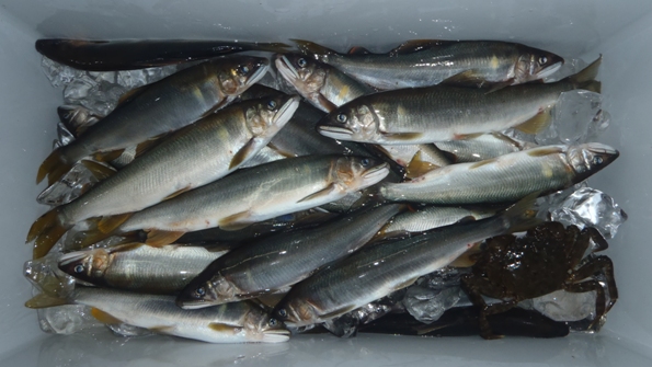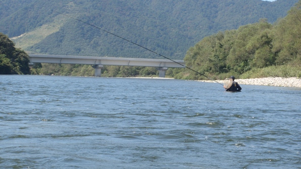19㎝の金鮎 腰上まで浸かり流れに耐えながらサイズはバラバラだが1時間で10尾が釣れた。Jちゃんにこっちへ来る様に