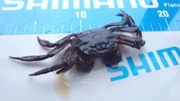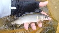 午後の始まりはカニかよ…味噌汁にして食べてやるー!気を取り直し囮も交換し流芯へブッ込んだ“ガガーン”対岸の方へ打っ飛んだ////流れの緩い方へ引き入れたが浮かんずら…2歩4歩6歩下がり引き抜いた。あぶねーあぶねータモ外ししそうになった、親指小指間より大きい推定22㎝これはキープし、別の囮に替え再度同じ流芯へ…3分後、目印が水中に引き込む当り!!19㎝ゲット。ここはやる気ある鮎が居る様なので、Jちゃんへ電話した「1尾釣れてもう少しして行く…」5尾釣れたところで雨がポツポツ、上流では景色が白く成っていた、しばらくしたらここも雨が強くなるだろうか? Jちゃんが来て雨が強く成ったら止める事にし、Jちゃんに猛烈な当りの1尾を釣らせたく場をズレたが、我輩も掛らない?水温を計ると2℃下がっていた…我輩1尾追加、Jちゃんへも「キター」18㎝の幅広鮎…雨が強くなり+1尾追加で15時に川から上がった。