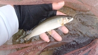 ガン玉を外して掛けアユを放すが////目印動かず、再度ガン玉付けた後“ガッン”状況が変わらないまま、ポツポツではあるが午前中12尾(21cmも釣れた)。他でも釣れない様で、3グループが様子を見に来た。