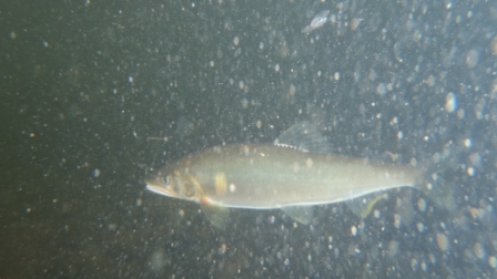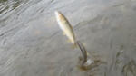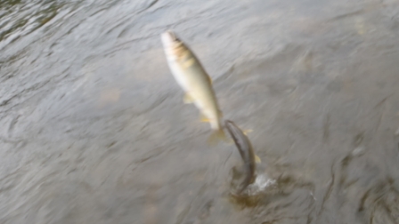 午後、反対側から攻め2尾釣ったが、1尾放流と舟の中が増えない(^_^;)、思いきって下流のトロチャラへ移動した。背カンに替え泳がせに撤する釣りをした≫立て竿/下竿と竿先を時より効かせる=尾をふらせると>゜))彡“カツーン”“ガガーン”瀬で追いが鈍かったのが嘘の様に、全て背掛りで掛ってくれた。10尾ほど釣ったら反応が無くなり終了(4時半)。