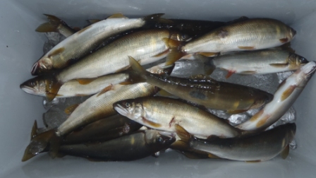 橋の上は空巣だったので、早々に着替えて>>>ノッケからやっちゃいました(+_+)手からツルっとオトリが逃げてしまった“あちゃー”気を取り直し車に戻り手袋をした。まずは、急瀬を避け無難に取り込める場所からとした≫鼻カンを無事付け放った。1尾目は直ぐ掛り、もう1尾釣って急瀬をと思ったがなかなか掛らない?瀬肩に移動し1.5号のオモリを付け探る≫2度ケラレた為、2本チラシへ変更して探る“ドカーン”急瀬へ引き込まれたが、竿を信頼して思いっきり抜いた//ブーメランやっちゃいました。この瀬肩で3尾釣りパタリと止まり、急瀬へオトリを入れた、地球釣ってプッツン(>_<)ラインもボロボロ…仕掛けを張り直し石が小さい瀬端をベタ竿で待つと“ガガーン”“ドッカーン”と2連続。しかし、その後思ったほど掛らなくW放流などもあり、午前中は7尾止まりであった。