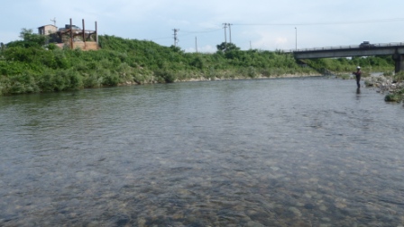 遊魚券とオトリを入手し、水明橋から三面川を覗う!電話で確認したとおり、濁水(>_<)高根川へと向かった。上流は大石なのだが、短竿を持って来ていない為、川幅が広い小石だらけの下流の橋へ…