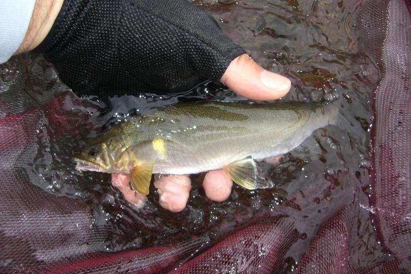 放流で弱って流された居残りを狙って、竿出しているのが恥ずかしいので道路から外れた(阿賀川合流2キロ上流)地点で行った。