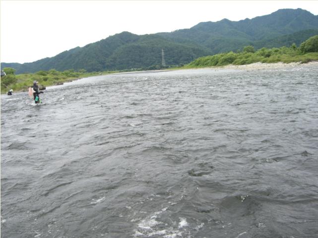 朝19℃だった水温も21℃まで上がっていた。午後は入れ掛りを期待したいし、捨て糸を04に変え形が良い瀬釣りに徹しよう。22cmに鼻カンを通し、さぁオトリをポイントへ入れ舟に目が向いたら・・・またやっちゃいました~蓋が開いていた(>_<)腹掛かりの1尾を除いて放流してしまったのだ。又も最悪、入れたオトリも根掛り回収出来ず・・・朝に戻った感じだった。