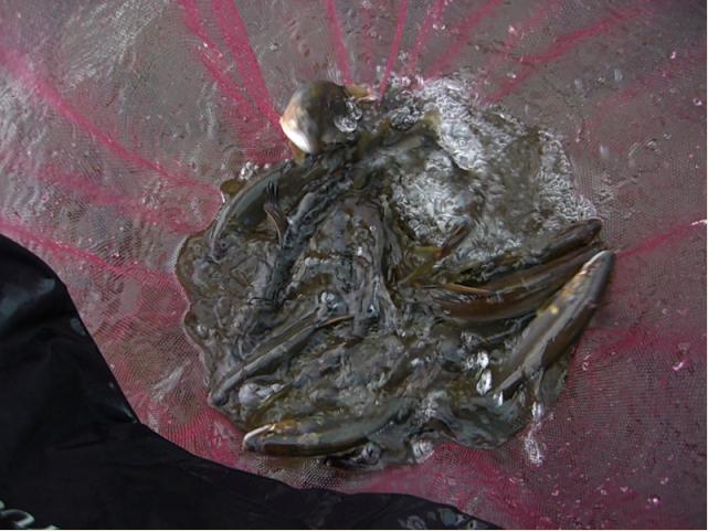 気を取り直し、残りのオトリに願いを込め、またドボンはキツイので流れの緩いヶ所へ入れた。20分後18cmをキャッチできた(ホッ!)午前中はポツポツしか釣れなかった、2ドボンと1すっぽ抜けで舟中は7尾。