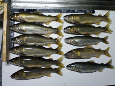 2時頃、下流へ移動し竿が無い瀬釣り個所へ入る事にしたが、キープオトリが大半天国に・・・1時間もあっちこっちしてたからか?4つはよれよれではあるが使えるか?早々に舟を川に沈め、瀬肩から始めるがガン玉を付けても全然ダメ(>_<) Jちゃんのオトリは何とか泳いでいるが・・・ 最初に釣れた10cmのチビアユが残っている!ガン玉を2号に替え、芯へ・・・!ッ“きたー”デカッ20cmが掛かった。オトリ変わりしたら、また直ぐきた。Jちゃんも掛かり、それから、芯を攻めると20cmが“ガッ”身切れやW放流があったが、Jちゃんも我輩もこの場所で10尾↑(右写真我輩11尾)釣って終了。