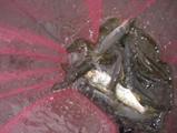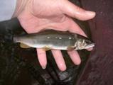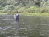 風が強く今にも泣くような空模様の中の釣り開始(8:40) 川に入るとアユは沢山(チビ)、足下を泳いでいる!対岸の流芯へオトリを泳がせ先ず1尾(16cm)ゲッ!背掛けで来た、流芯の形は良い様だ!さて今回の仕掛けは前回のチビ対策仕掛けの間々の釣りです!手返しがキーなのだが、1尾掛けてから無無無?サッパリ掛からない状態だった。足下は10cm以下のアユが逃げる事なく泳いでいる。流芯を外し小砂利の手前へ入れ直しし1時間後の2尾目(12cm)を掛ける。岩ちゃんは強い風で竿を持つのが大変な様子であった。あっと言う間に正午に成り、岩ちゃんはカジカ1尾、我輩は4尾で飯とした。風で肌寒いがキンキンに冷えたビールを飲み干し弁当を食べ終えると、午前中ゼロの岩ちゃん気合の“さぁ,やんぞ!”午後になりますます風が強くなり厚い雲で薄暗い状態になった。午前の場所はサッパリの為、水深1.5Mの深場へ、根掛かりしたら回収不能であろう所へ、オトリを無理足・・・。入った途端来ました!おっ,深場で浮いてこない・・やっと抜いたら良方の19cm。その後、3尾釣ったところで雨を飛ばして来た。下流域は雨が降っている様で、ここも今にも降りそうな為、余り釣れないので納竿とした(2:50)