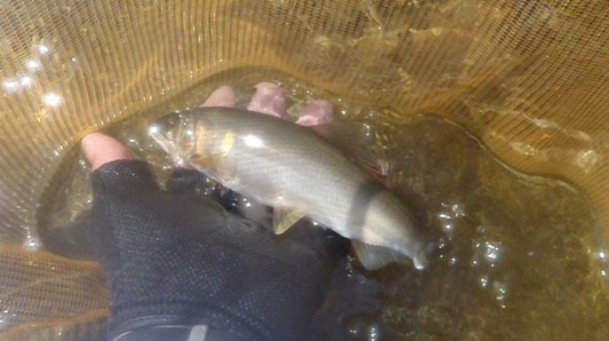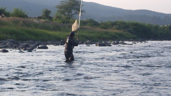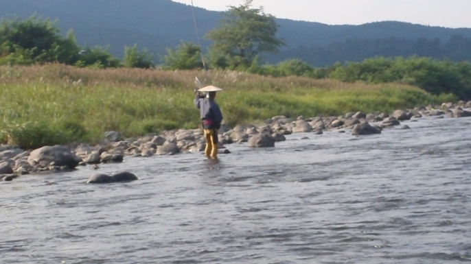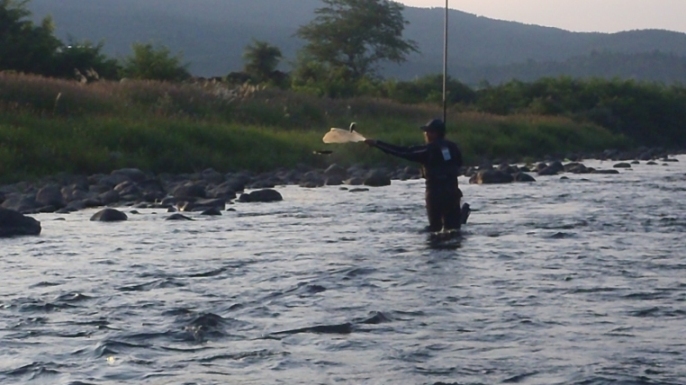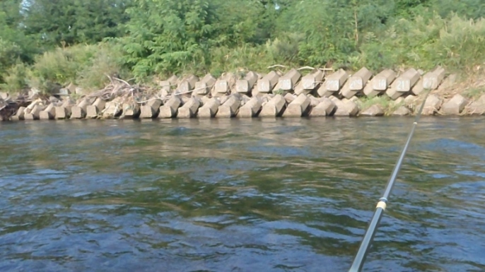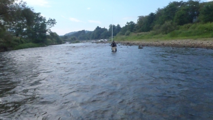 針金に絡んでいた。針金と木を取り除いて、後から再度狙うとして、5M下がった所からRe-START。オトリが対岸に泳いで行くと待望の