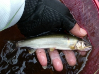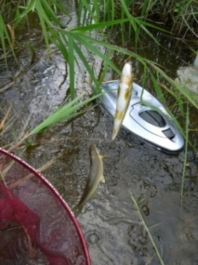 ビラビラビラビラと鮎が通過後、川の様子が変わった感じがしたと思ったら、いきなり印が飛んだ!!15cmが背掛けで来た。その後、飛ぶ飛ぶガ・ガ~ンと背で掛かる掛かる。昨年は3尾、今年は6尾(12~19cm)という結果でした。