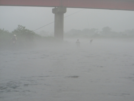 高田橋上に戻るが、依然と靄で何処に人が入っているか見えないが下に降りた、4名が竿を出していた、その上隅に入った。隣りの人の先は靄で見えない時もあった。