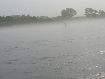 さて、オトリを放つ???いきなりの根掛かり、川中は草やビニールのゴミだらけである。今年は大雨が無かった為か?靄でゴミの流れが見えない事もあってビニール袋に引っ掛かりオトリと(^^)/~~~するしで気合空振り、8時に成って日が射し靄が薄れてきた。