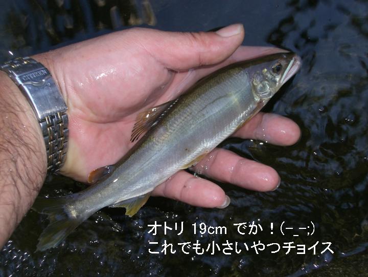 5時の烽火に目を覚まし、早々と相川(友専用区)へ車を走らせた。途中、新町橋、白子では1~3名しか川に入って無い?相川は見学も含め10名は居ただろうか、解禁と思えない状景だった。30分様子を伺っていたが、サッパリである。鮎の姿無し、ナメ跡無し?そうは言っても、今日は有休でこの日を迎えたのだから、竿ださない訳にゃいかんでしょう!オトリを買いに行ってビックらこいた!デカ!20cmオーバーばかり… それでも小さめの2尾をチョイス。相川へ戻るが、まだ1本も釣れとらんと言う事で白子から竿を出す事にした。ここも、ナメ跡無し?岩盤には有るかと思ったが・・・しょうがねぇ~竿入れんべ!2時間いろんなこと探ったが?だ~めだこりゃ!!!淳ちゃんが朝飯持って来てくれたので、川で朝食を取り、その後上流へ移動し淳ちゃん2尾"チッチェー"我輩は○、12時になり淳ちゃんが帰り、我は相川へ…何ぼか釣れていた。○は今後の釣りにやばいっしょ!ここで竿入れさせてもらった。下流に下り、一瀬にナメ跡を発見しデカオトリを(騙し)2使いヤットコ!スカ免れる。その後(ポツラ)2…あらッ、kobiさん?様子を見に来たのです。昔釣った夢の雑談、土日はなじょすんべぇ~てな事も… 今日はスカに成らんで良かった。