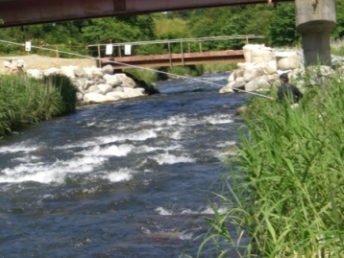 各所を見て回り、支流の四時へ入る事にした。観光ヤナhttp://nanahama.com/yana/p/frame.htmで朝弁を食べ、入漁券(1500)オトリ(500/尾)購入。下流は小さいと言う事なので、このヤナより上流の二人が入れそうな場所を見つけ8時半竿入れ!シーズン初は1尾を取り込むまでゾクゾクする。それは、糸をたらしてあっと言う間に来た。風が強く、O-Newのタモにちゃんと入るか心配しつつも、空を切りタモの中に初鮎が納まりホッとする。(O-Newは最初が肝心と思っている我輩)
