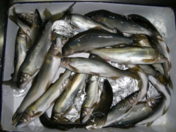 1尾を掛けて数分後、石の上に立ち込んでいた時である、体が揺れる感覚に襲われ転びそうに成った?ン…石がグラ付くのかなと思ったが、いや、地震だ!体に感じたのは1度だけであった。風は段々強くなり、オトリが宙を泳ぐ状況が幾度かあった。地震と強風の為か午前中は、6尾と散々な結果であった。