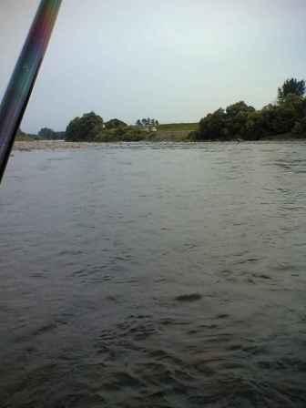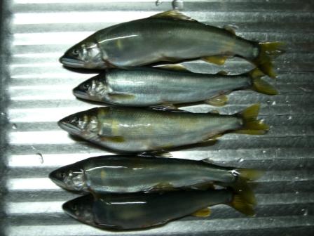 気を取り直してオトリを上流へ泳がし反転させたところ、ガツと飛んだ!お・お、浮かない浅瀬に誘導しキャッチ23㎝は無かったが21㎝であった。その後は続かずチビ鮎が先行で釣れる為、オトリ回しで苦戦。12時過ぎに一時的な雨でゴミと濁りが入り、オトリに成る鮎が釣れたが後が続かず・・・